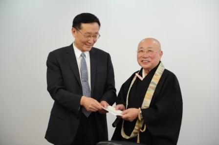 まずはじめに訪れた日本赤十字社では、三井俊介総務局組織推進部長に義援金100万円を手渡し、現地での活動について説明を受けた。次に世界仏教徒連盟を訪れ、同連盟人道支援委員会の正本乗光委員長と面談し、義援金70万円を、また、仏教NGOネットワークを訪れ、茂田真澄事務局長に義援金703,629円をそれぞれ寄託した。最後にシャンティ国際ボランティア会を訪れ、関尚士事務局長に義援金100万円を寄託し、現地の状況について説明を受けた。