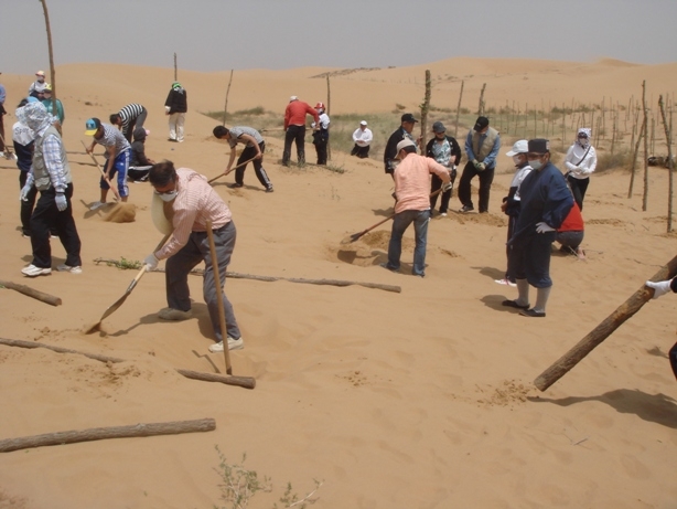 その後、植林場所に向かい植林を開始、集まった現地の人々は100名。中には、林業局職員25名・高校生40名も含まれていた。また、植林期間中、沙漠特有の砂嵐で作業ができないというハプニングもあったが、400本を植林することができた。
