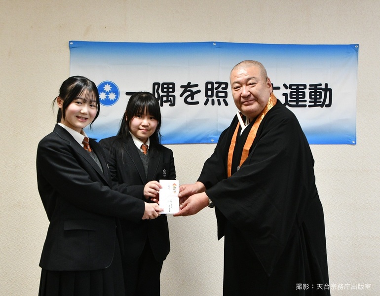 社会福祉法人滋賀県共同募金会から桐畑正彦常務理事・事務局長、日本赤十字社滋賀県支部から里見紀久子事業推進課長、NHK大津放送局から小磯亮局長に来庁いただき、一隅を照らす運動細野舜海理事長、同運動副理事長代理・天台宗参務大実豊財務部長からそれぞれ目録が手渡された。