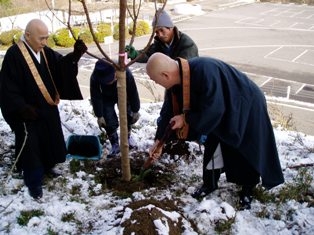 一隅を照らす運動総本部では、12月13日に比叡山ドライブウエイに、12月19日に奥比叡ドライブウエイに、12本のモミジ・桜・ナナカマドの木をドライブウエイの道路脇に植樹し、秋吉文隆(一隅を照らす運動総本部長)も自ら植樹に参加した(写真)。