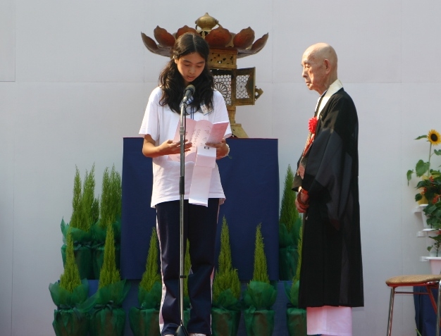 寄託式では、中学生を代表して村松正子さんが「世界では過酷な内戦や紛争により多くの子どもたちが殺され、家や家族を奪われ、重い傷や障害を負っています。どうか、こうした子どもたちを救って下さい。私たちが平和への願いを込めて持ち寄った募金を世界の子どもたちの救済のために寄託します」と記された目録を読み上げ、小堀光詮一隅を照らす運動会長へ手渡し、引き続き、小堀会長から早水研日本ユニセフ協会専務理事に贈られた。