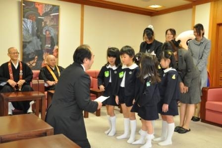 また、寄託式には延暦寺幼稚園から竹林幸祥園長先生と、園児と保護者8名も出席し、秋に行われたバザーの収益金が、園児達から辻田局長に手渡された。