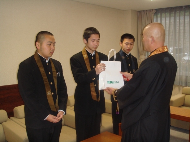 平成21年2月4日、比叡山高校宗内生4名と教員1名が天台宗務庁に来庁。昨年末12月21日、比叡山麓大津市仰木地区で行った寒行托鉢の浄財133,000円を地球救援募金として、秋吉文隆一隅を照らす運動総本部長に手渡した。