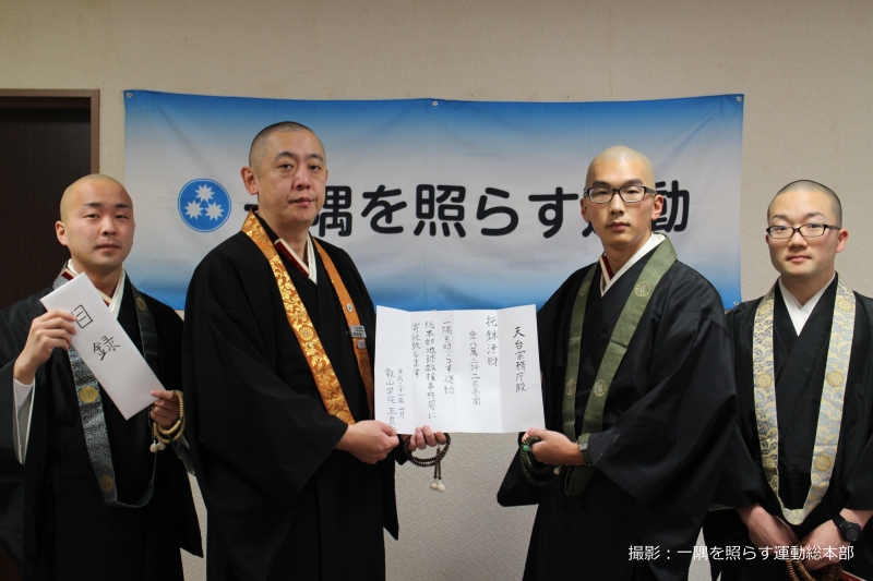 令和7年1月31日、叡山学院生4名、米田瑞徳さん(総合学科3年)、大川戸仁泰さん(総合学科2年)、宇野光俊さん(研究学科1年)、野﨑良継さん(研究学科1年)が来庁し、寒行托鉢にて寄せられた浄財を「令和6年能登半島地震災害および豪雨災害義援金」として一隅を照らす運動荒樋勝善総本部長へ手渡した。