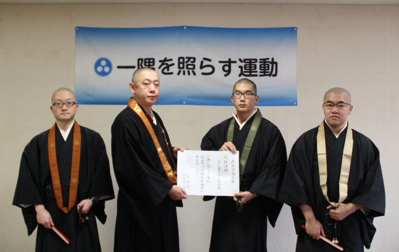 令和7年1月31日、叡山学院生4名、米田瑞徳さん(総合学科3年)、大川戸仁泰さん(総合学科2年)、宇野光俊さん(研究学科1年)、野﨑良継さん(研究学科1年)が来庁し、寒行托鉢にて寄せられた浄財を「令和6年能登半島地震災害および豪雨災害義援金」として一隅を照らす運動荒樋勝善総本部長へ手渡した。