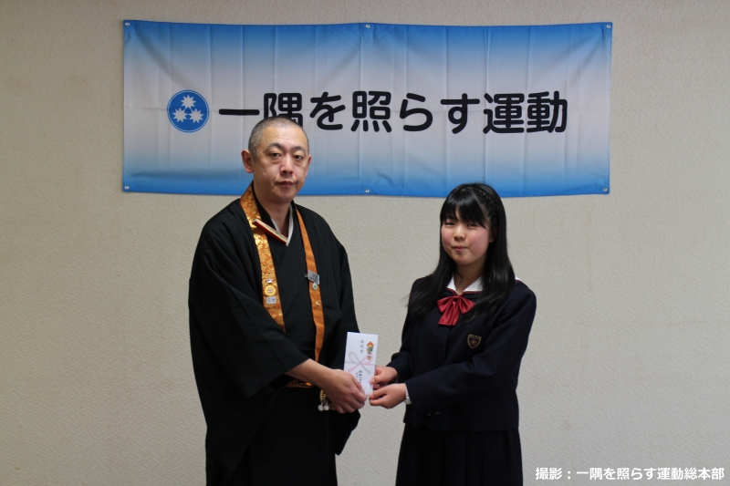 令和元年10月28日、比叡山中学校ボランティア委員会の代表である数野穂乃香さん(3年生)が来庁し、地球救援協力金として12,910円を森定慈仁一隅を照らす運動総本部長に寄託した。