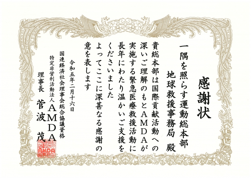 特定非営利活動法人AMDAより感謝状をいただきました!
