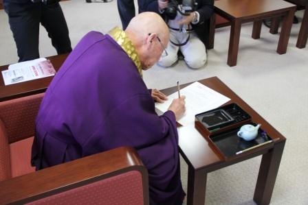 半田座主は、WCRPの杉谷義純評議員や委員の方から署名の趣旨説明を受け、署名用紙に氏名を墨書された。「オバマ大統領が核兵器削減を宣言されたように、この世界から核兵器がなくなり、一刻も早く貧困や飢餓のない平和な世界が実現されることを心より祈り、この署名運動が世界中で行われることを念願します」と話した。
