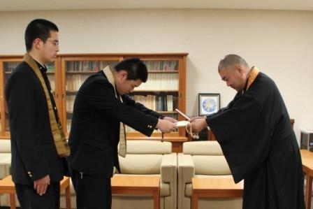 平成23年1月27日、比叡山高校宗内生2名と教員1名が天台宗務庁に来庁。昨年12月5日に比叡山麓大津市仰木地区で行った寒行托鉢の浄財84,727円を、地球救援募金として福惠善高一隅を照らす運動総本部長に手渡した。