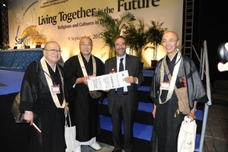 9日のオープニングセレモニー終了後、天台宗代表使節団、栢木寛照団長より、聖エジディオ共同体アジア地域責任者のアゴスティーノ・ジョバンニョーリ教授に共同体活動支援金として30万円を寄託した。