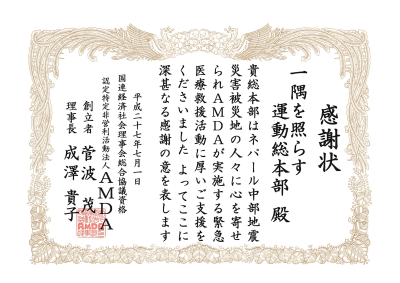 ネパール地震災害に対して認定特定非営利活動法人AMDAが行っている医療を中心とした現地での支援活動への協力として、一隅を照らす運動地球救援事務局宛にお寄せ頂きました浄財の一部を寄託いたしましたところ、その協力に対して感謝状をいただきました。