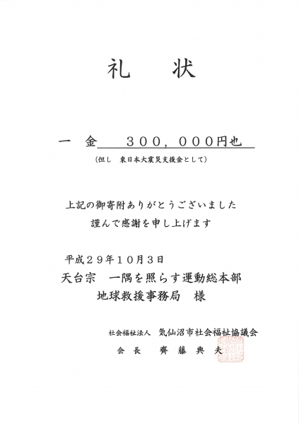 平成29年9月30日に開催いたしました「一隅フェスティバルin気仙沼」におきまして、みな様よりお寄せいただき、お預かりしております救援協力金より気仙沼市社会福祉協議会へ支援金を寄託いたしました。