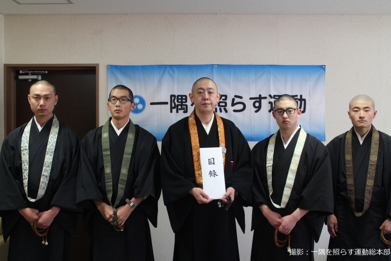 平成30年1月29日、叡山学院生4名が来庁し、平成30年1月23日に行った托鉢で集まった浄財を一隅を照らす運動総本部に寄託した。