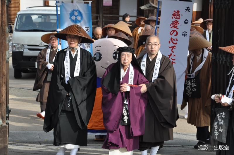 午前9時より、法螺貝の音を合図に生源寺を出発し、森川宏映天台座主を先頭に「造り道」を托鉢行脚。その後、一行は6班に分かれて坂本界隈の戸別托鉢を行い、多くの浄財が寄せられた。